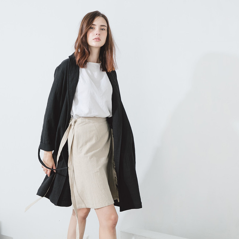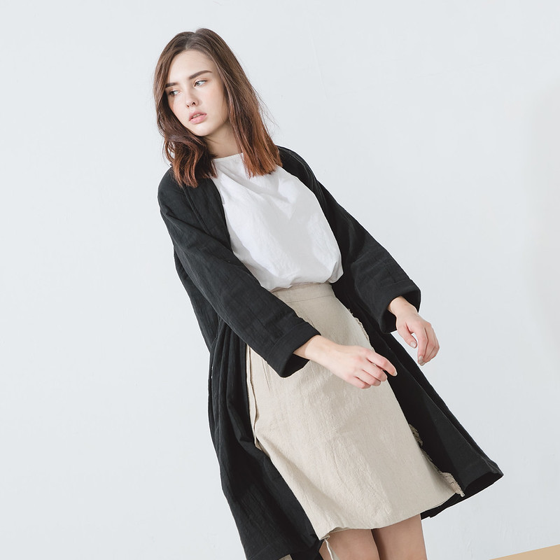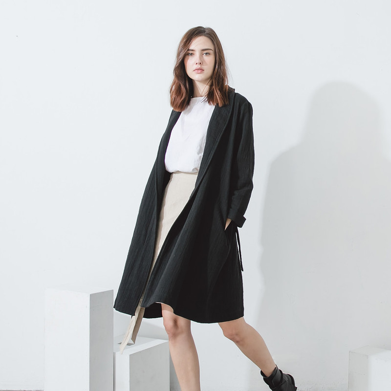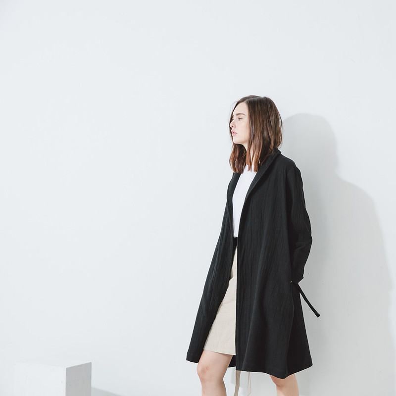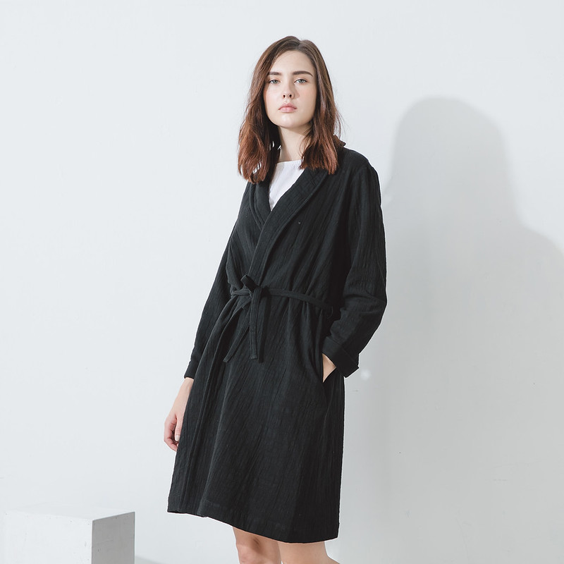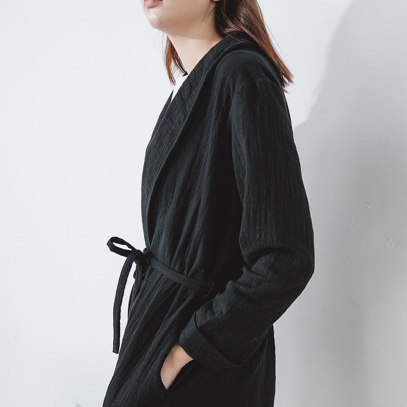 A minimalist black trenchcoat-style robe crafted from a cotton-linen blend that will lend a quiet, cinematic charm to everyday outfits. It fastens with a strap for versatile styling, while the fabric drapes elegantly — perfect for layering over dresses or trousers for a sophisticated, effortless look.