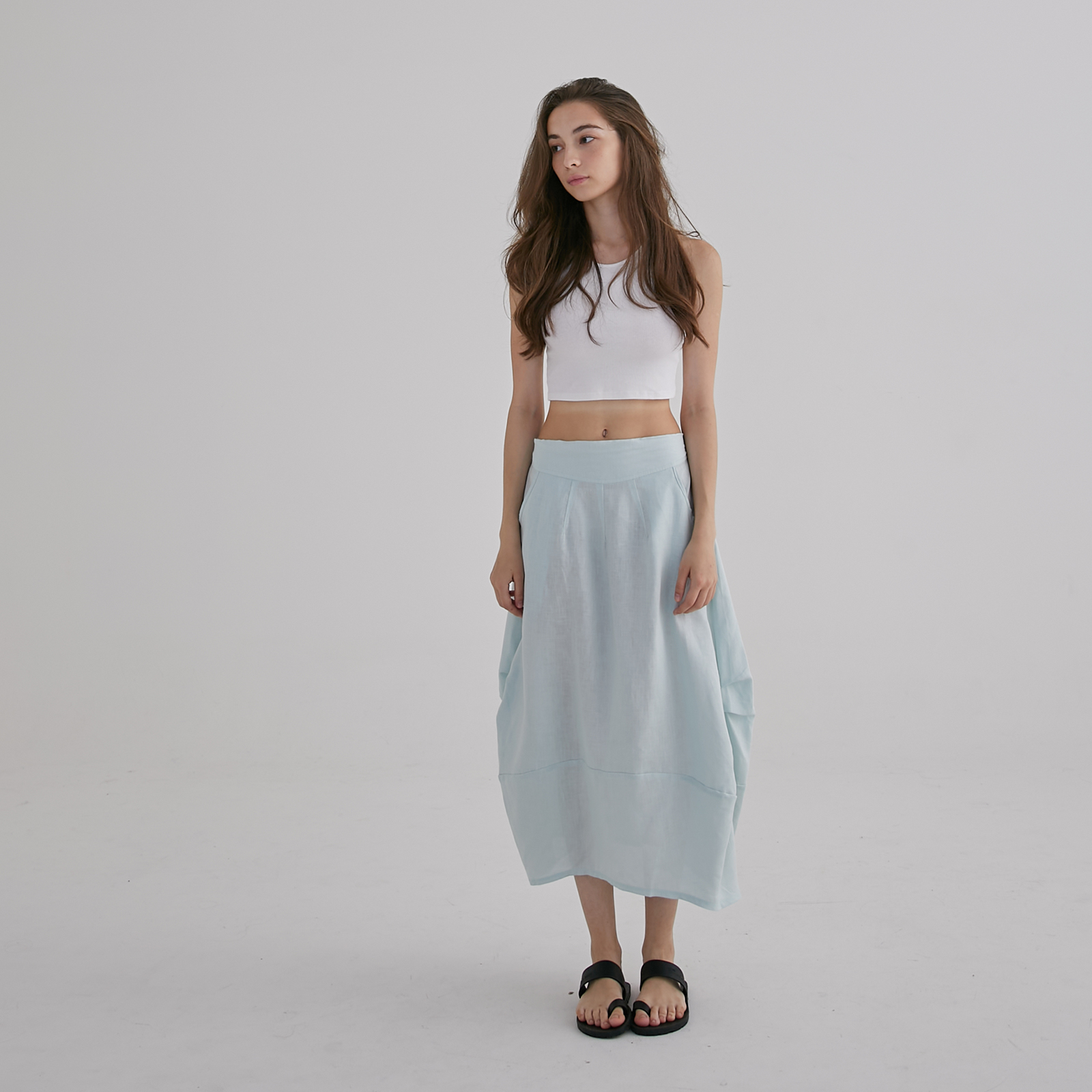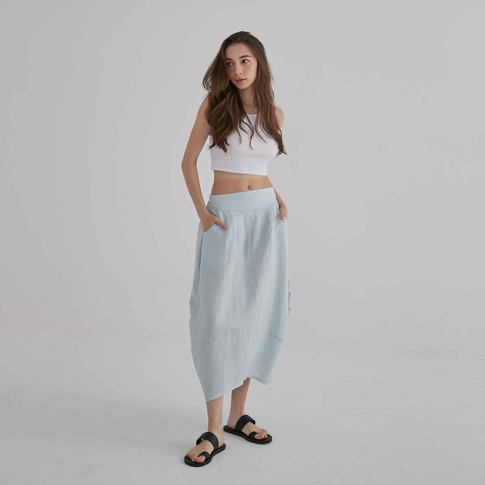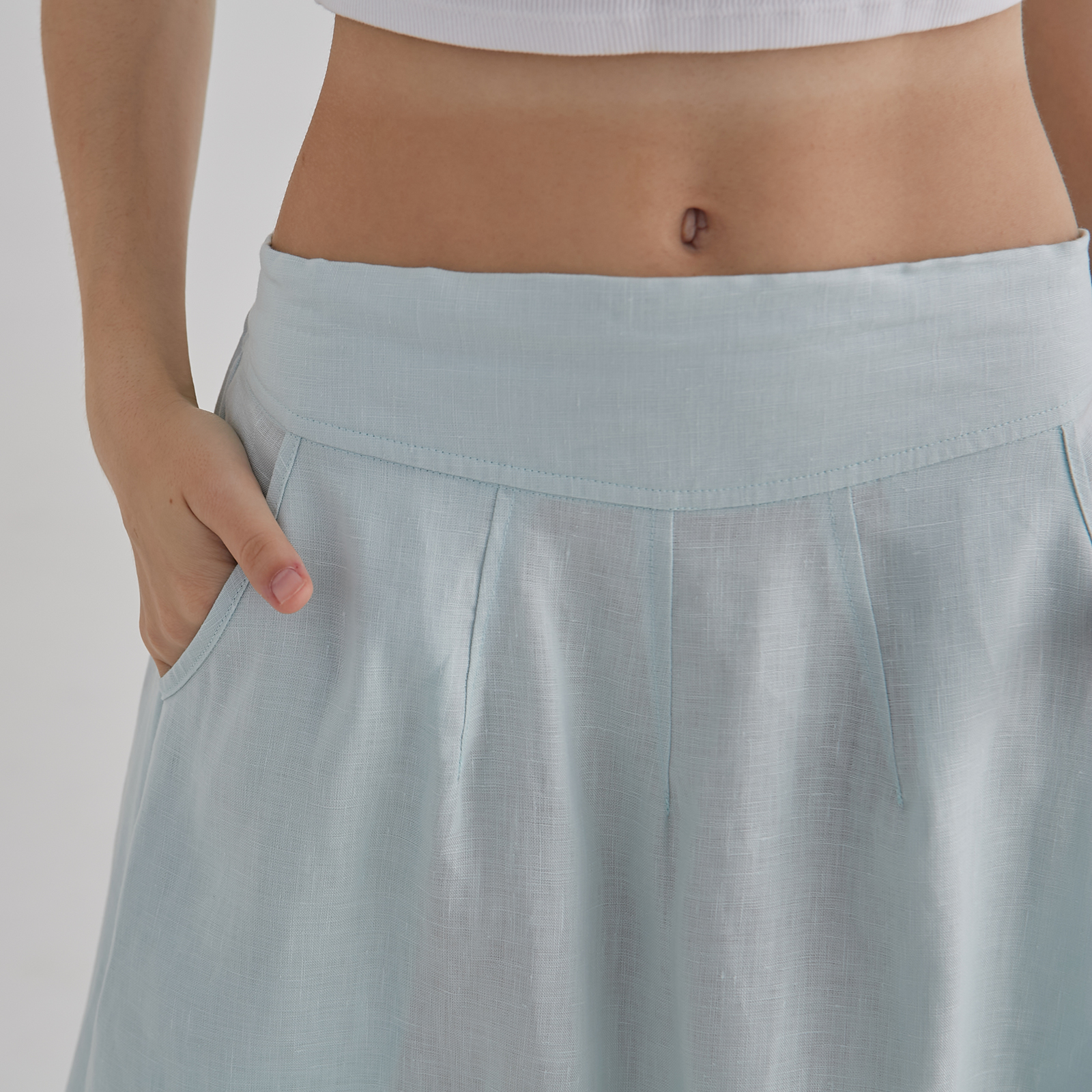 This light blue midi skirt falls in a soft, airy drape with a gentle A-line shape, finished with sculpted side panels that create a subtle layered effect as you move. The wide waistband keeps the silhouette clean and comfortable, while the lightweight fabric gives it an easy, breezy elegance — a relaxed, feminine piece perfect for warm days and effortless styling.