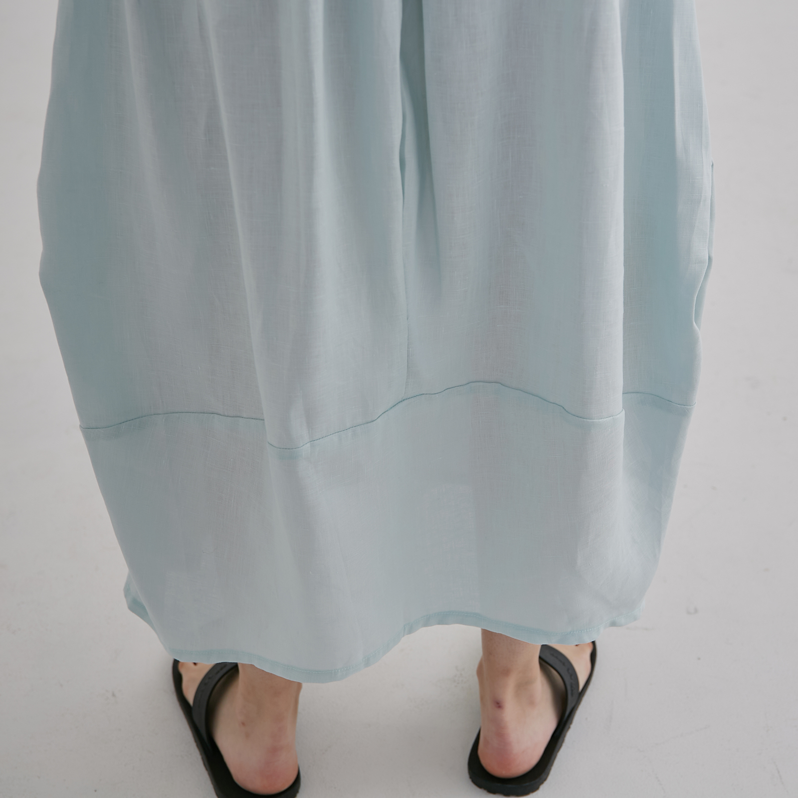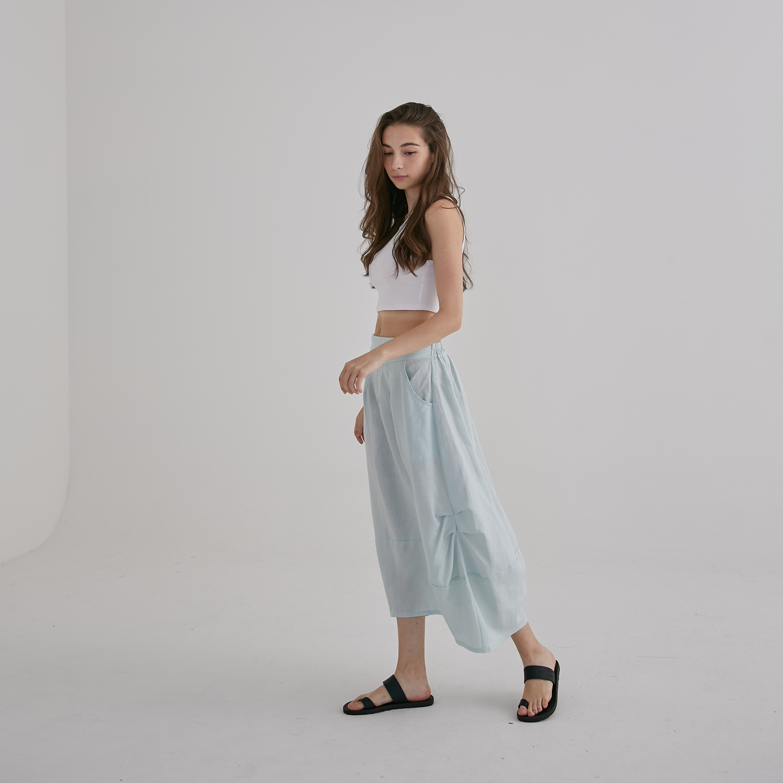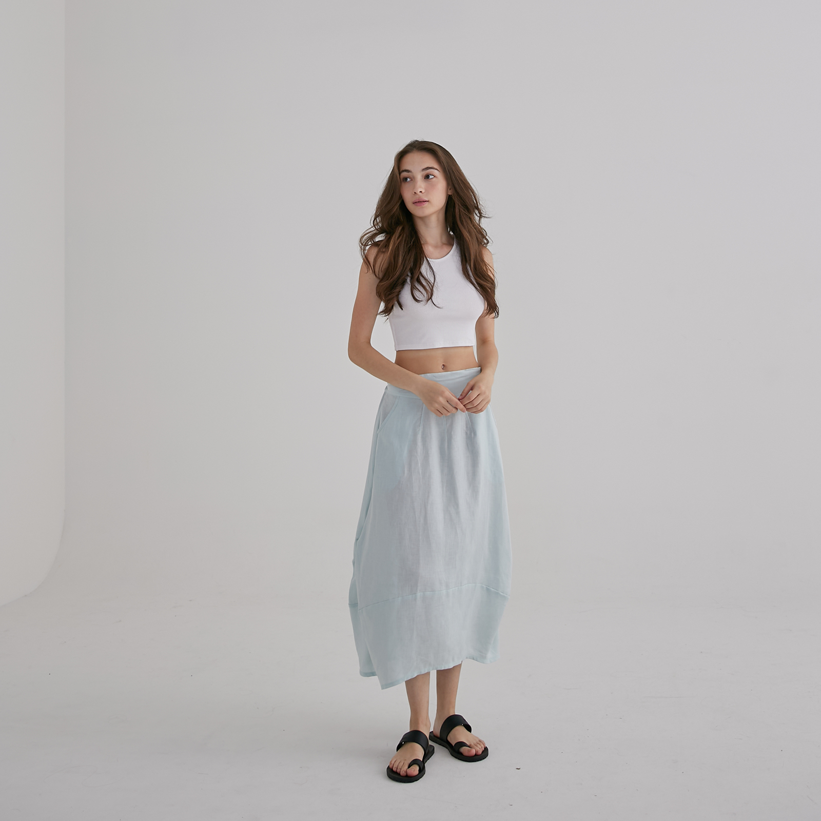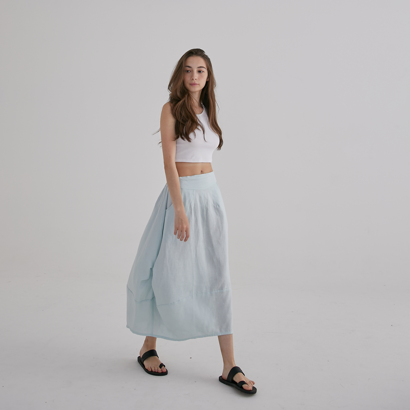 This light blue midi skirt falls in a soft, airy drape with a gentle A-line shape, finished with sculpted side panels that create a subtle layered effect as you move. The wide waistband keeps the silhouette clean and comfortable, while the lightweight fabric gives it an easy, breezy elegance — a relaxed, feminine piece perfect for warm days and effortless styling.
