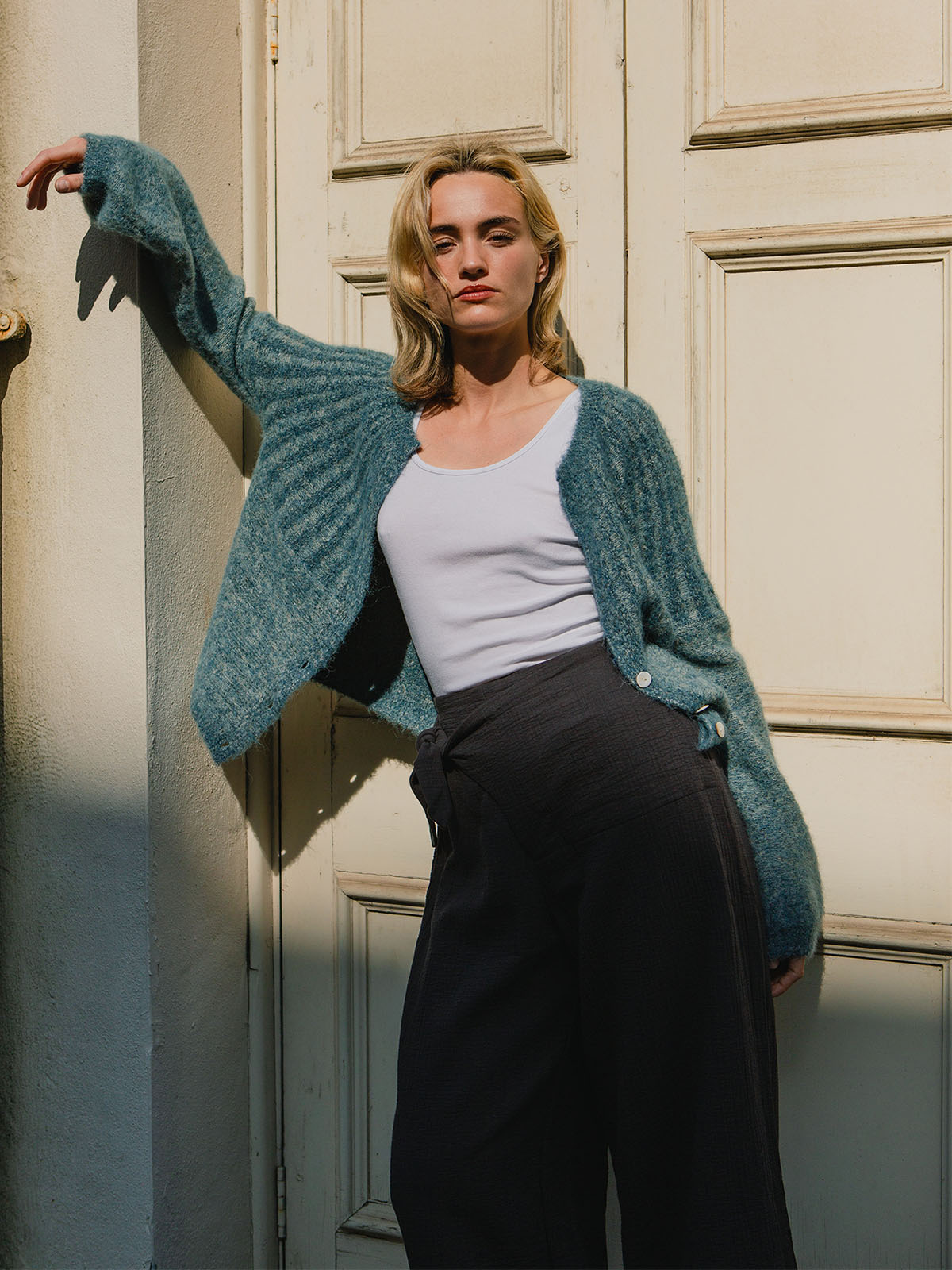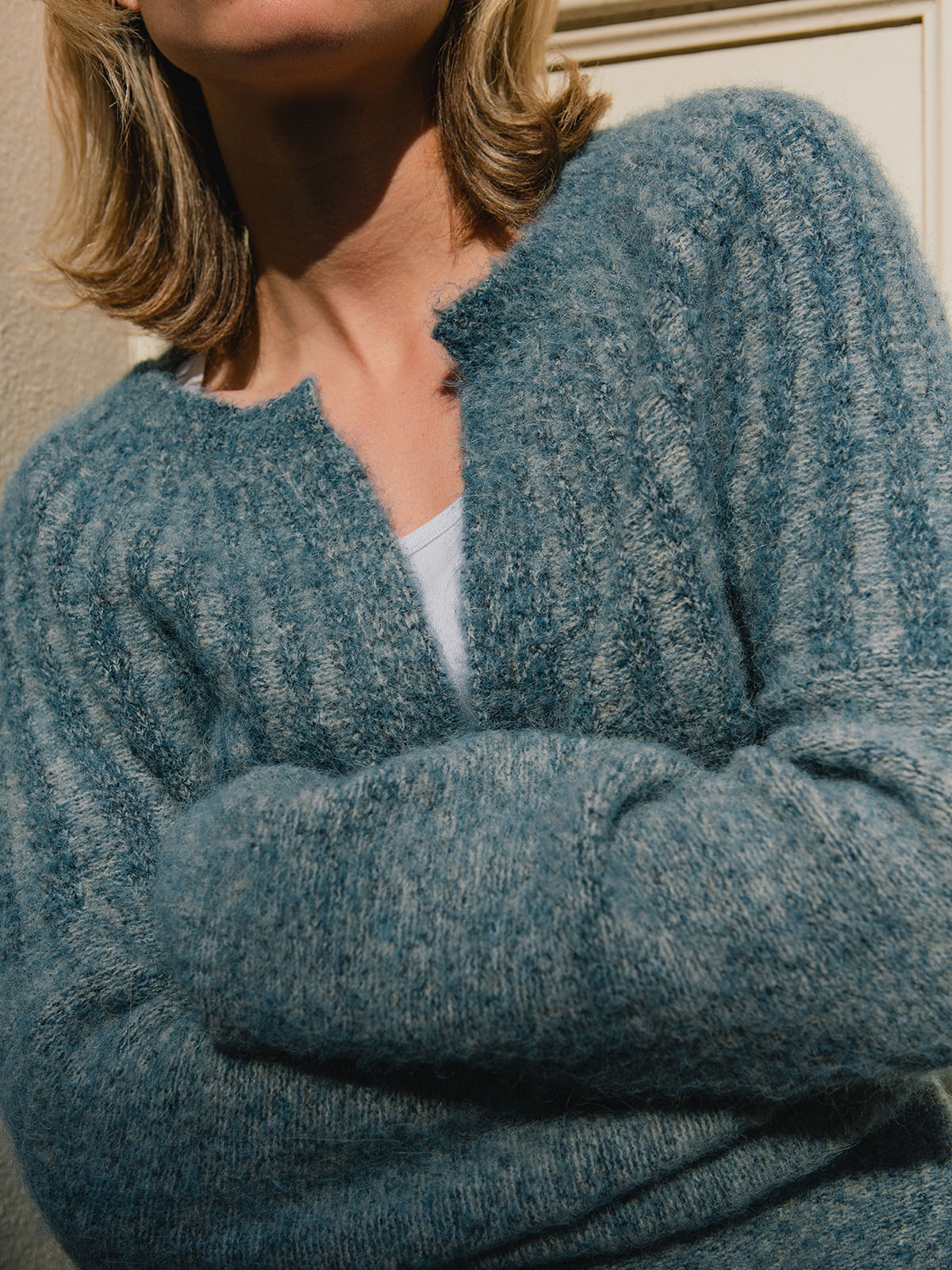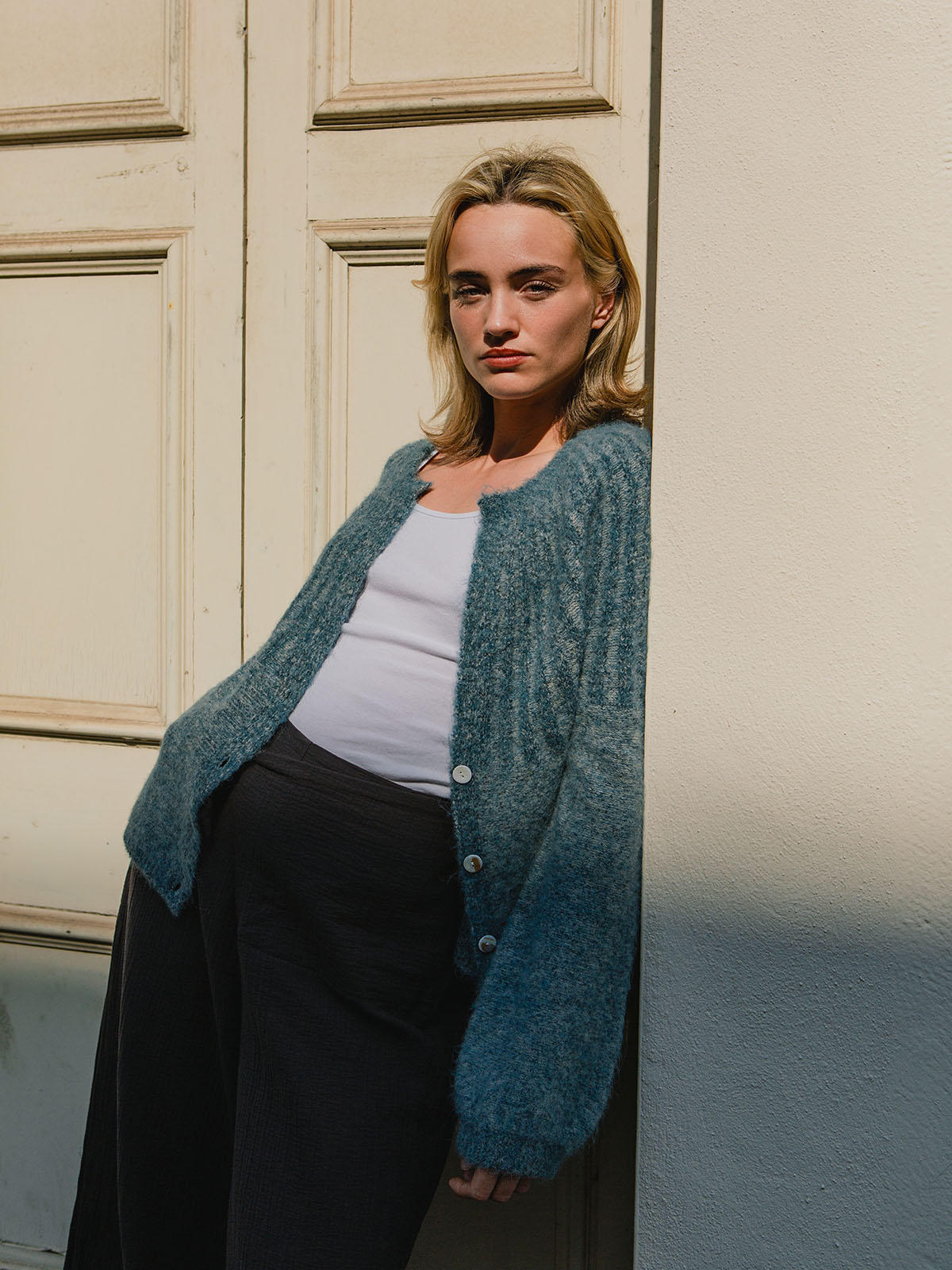 A beautifully lightweight cardigan in a muted blue-green tone, knitted from a softly brushed alpaca blend that feels airy yet warm. The relaxed fit is finished with wider cuffs for a gentle drape and effortless movement, making it an easy, elegant layer over simple everyday pieces.