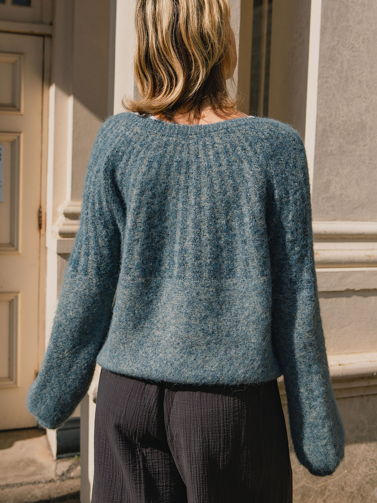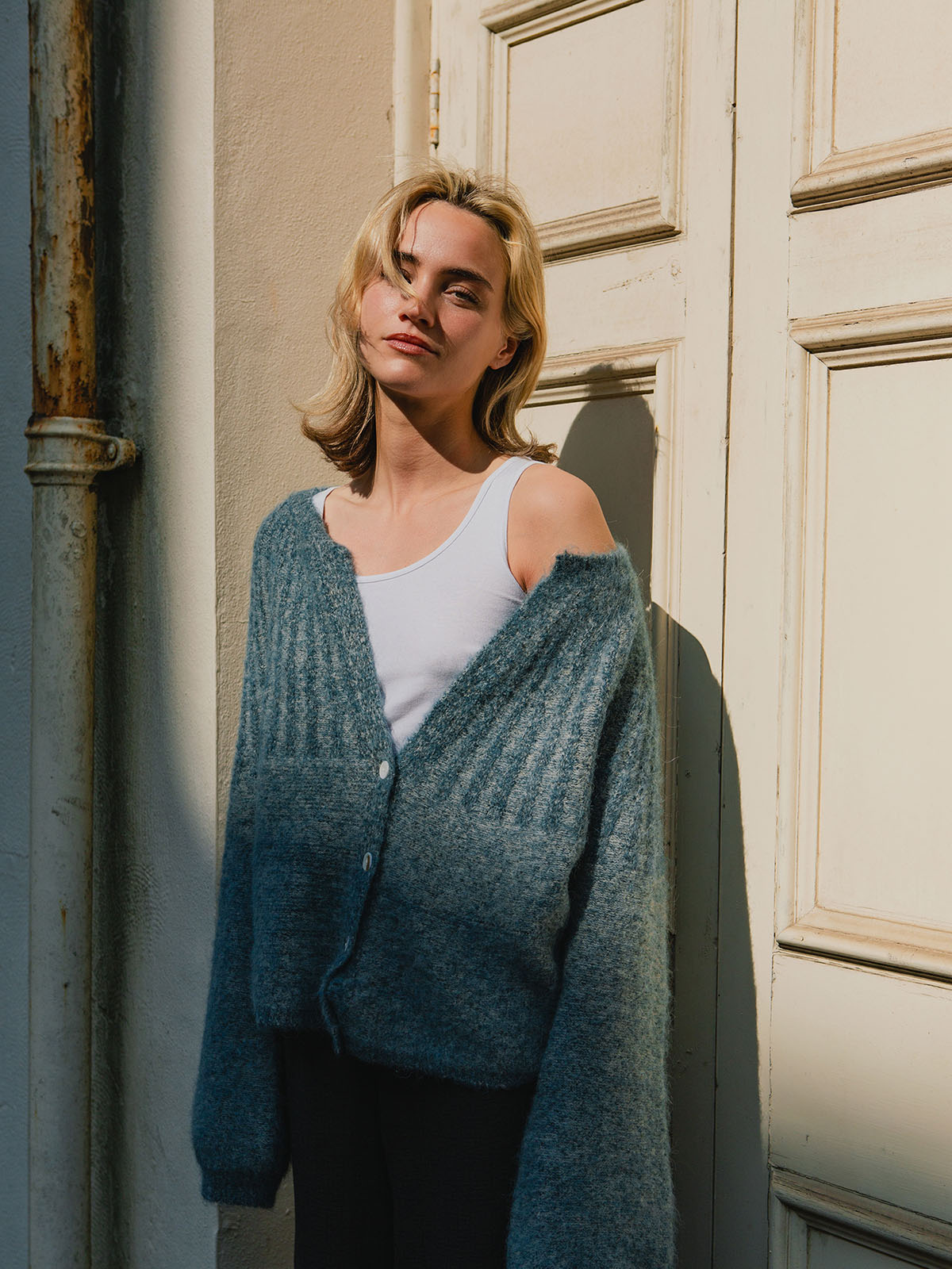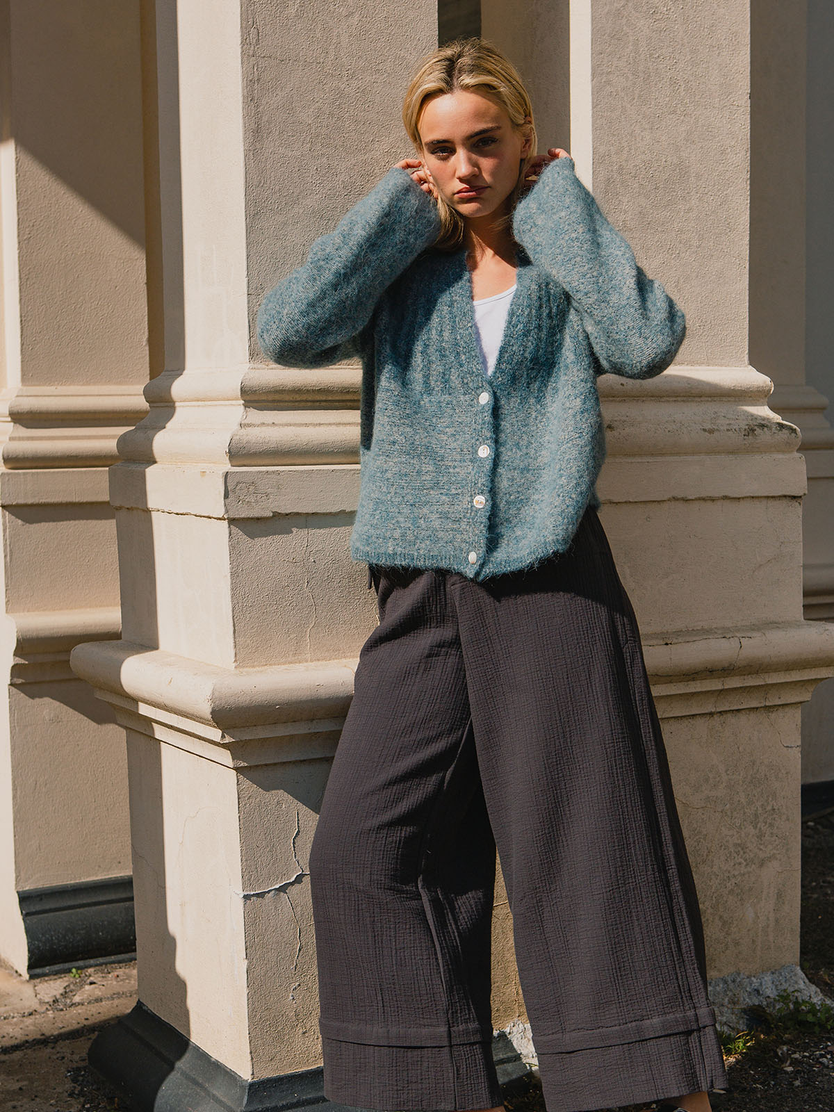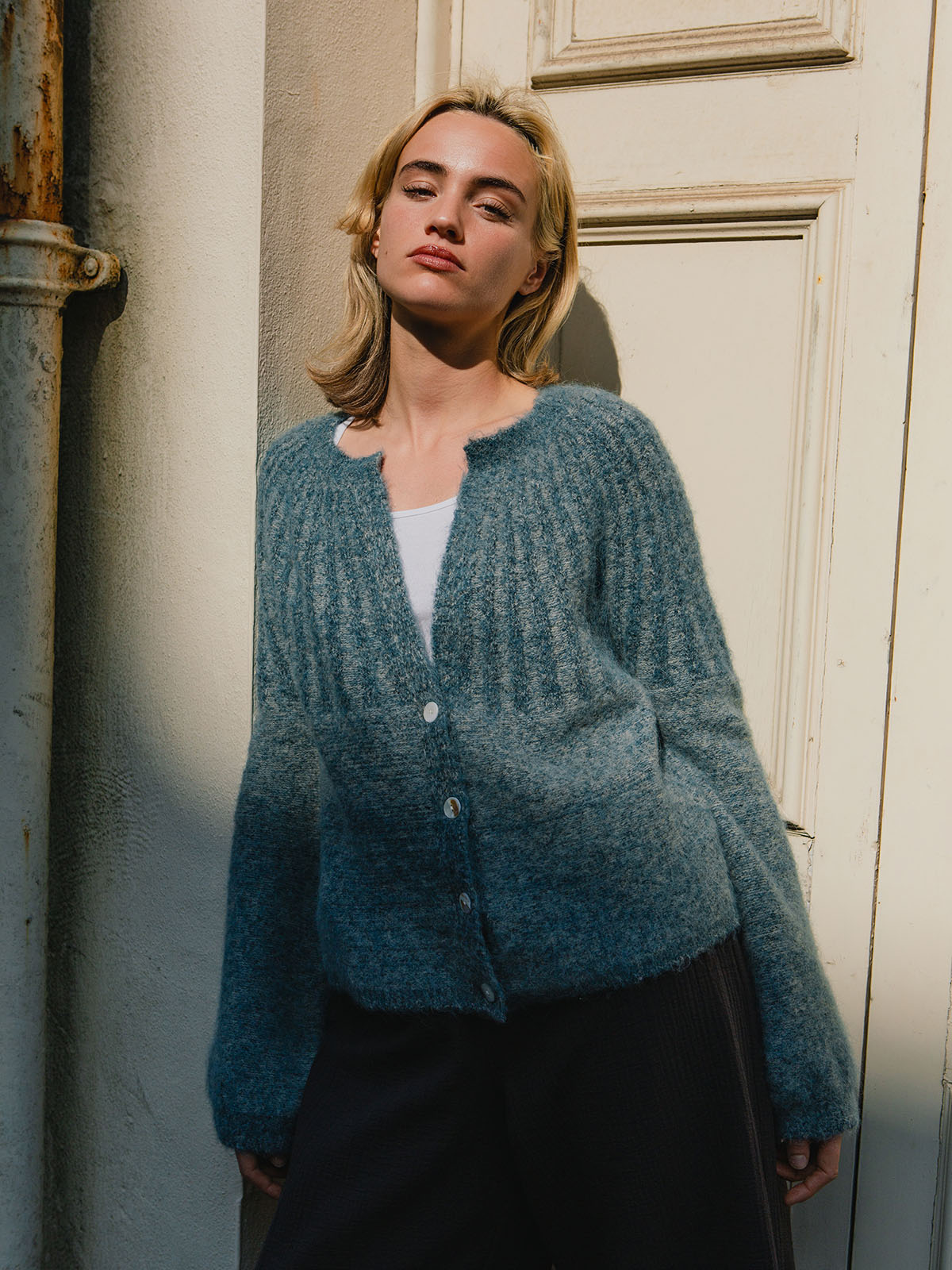 A beautifully lightweight cardigan in a muted blue-green tone, knitted from a softly brushed alpaca blend that feels airy yet warm. The relaxed fit is finished with wider cuffs for a gentle drape and effortless movement, making it an easy, elegant layer over simple everyday pieces.