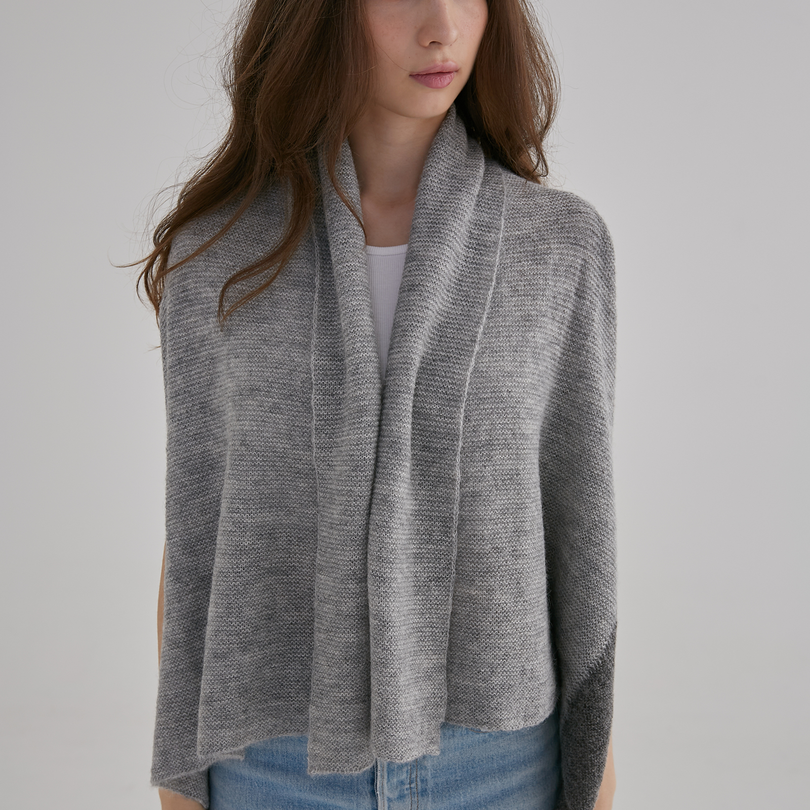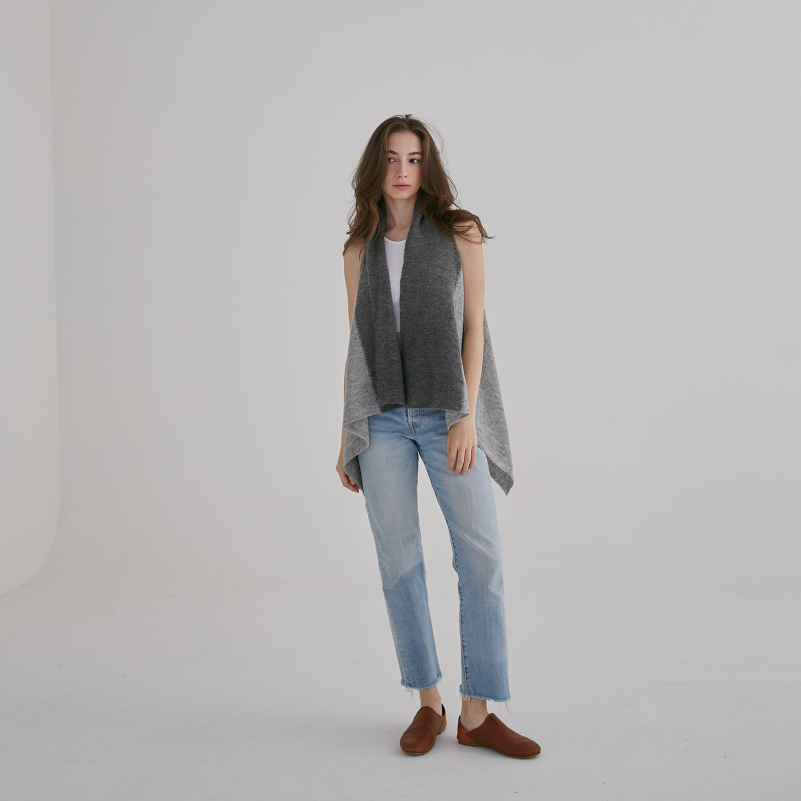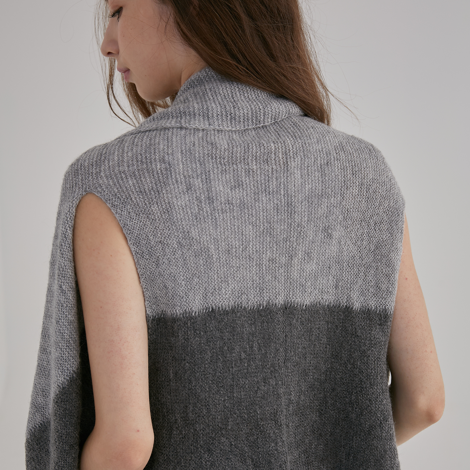 Soft alpaca blend in two tones, this convertible shawl vest doubles as a cosy layer or scarf for effortless warmth and style.