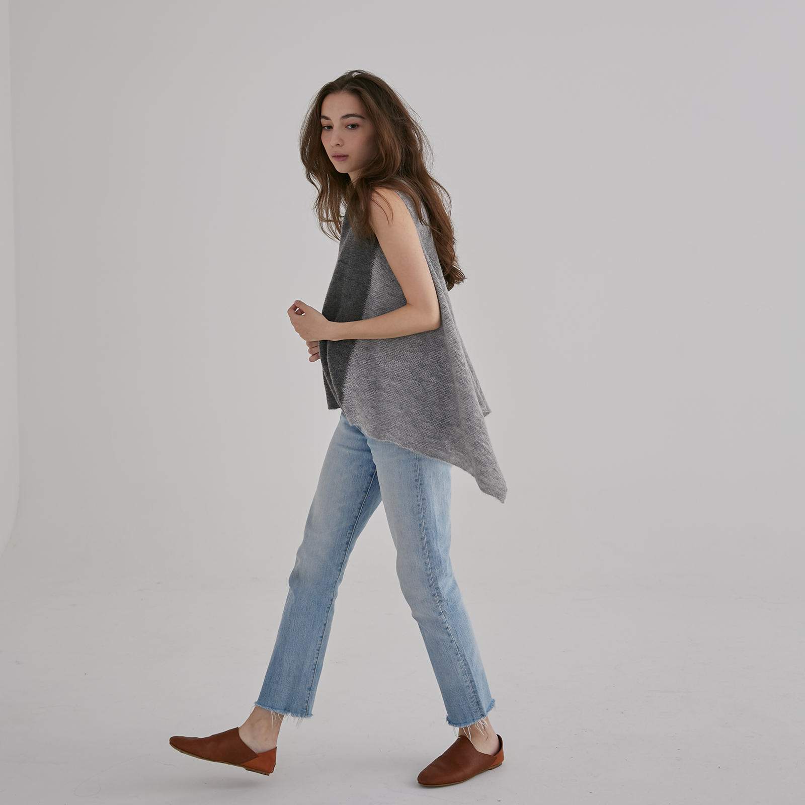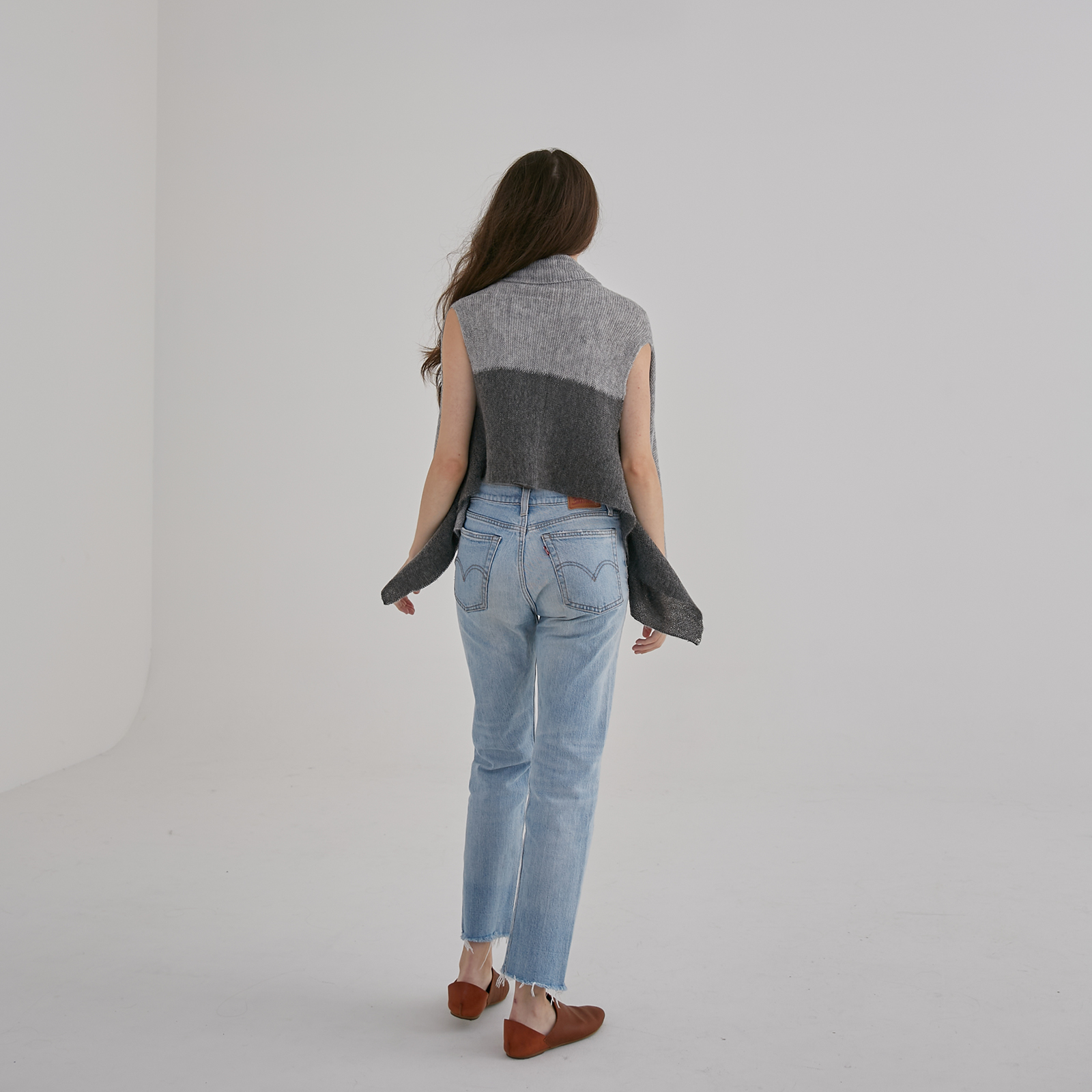 A beautifully versatile piece that can be worn as a short vest, a longer open layer, or even threaded through an armhole to become a cosy scarf. Knit from a soft alpaca-wool blend in contrasting dark and light tones, it brings a gentle touch of warmth and effortless layering to cool days.