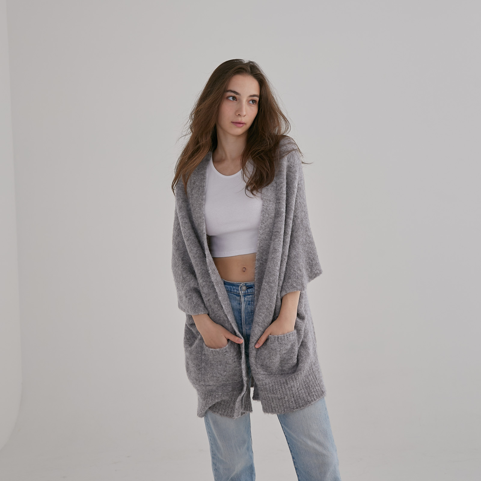 A lightweight, soft, and warm alpaca-blend cardigan with a clean, open-front design. The wide three-quarter sleeves and relaxed fit create an effortless layered look.