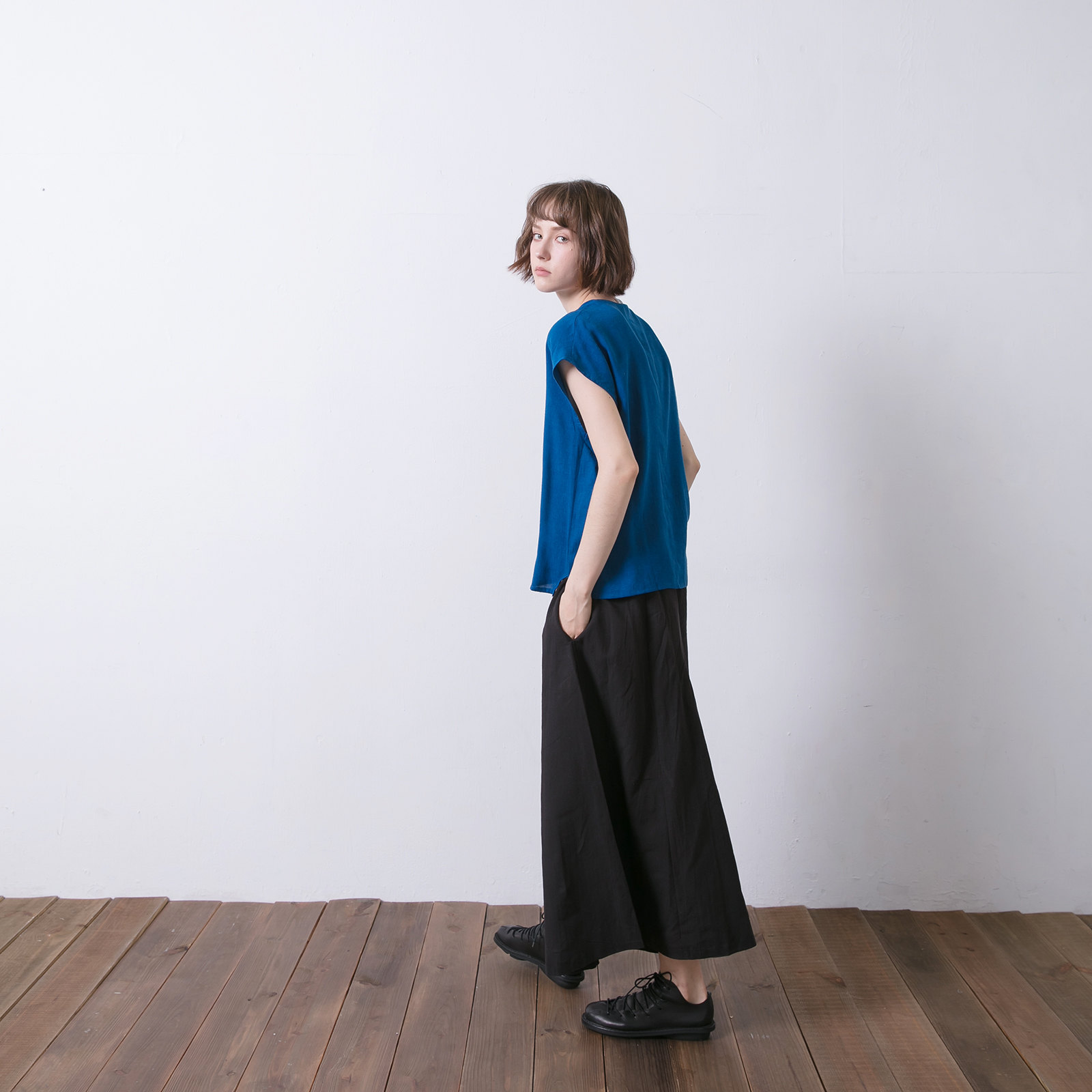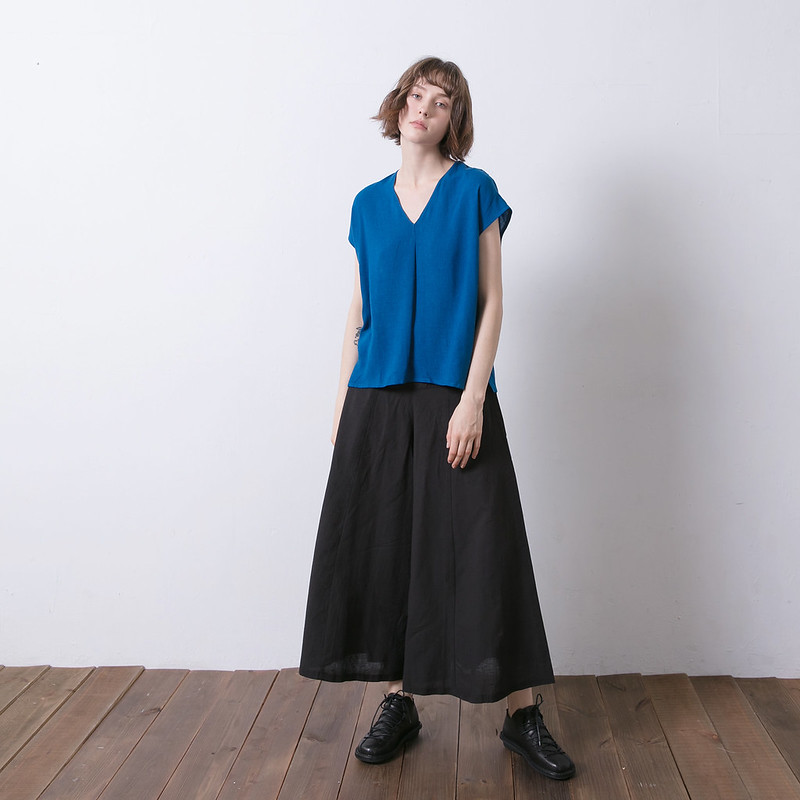 This relaxed V-neck top, made from a soft cotton-linen blend, features a gently inverted front pleat that gives the drape a graceful flow. Its dropped-shoulder cut offers ease and comfort, while side slits at the hem add subtle movement — a quietly elegant top that works just as well with jeans as with linen trousers.