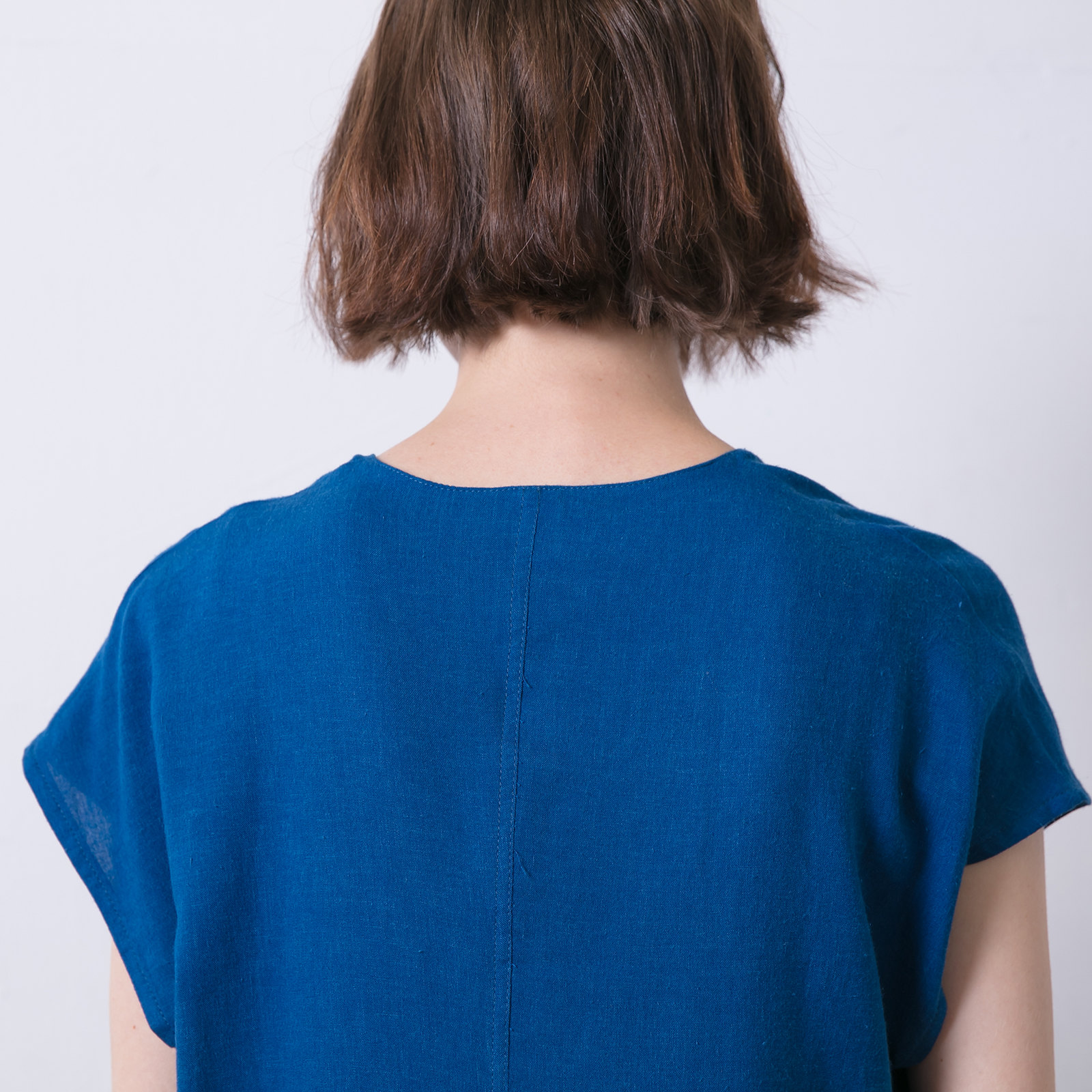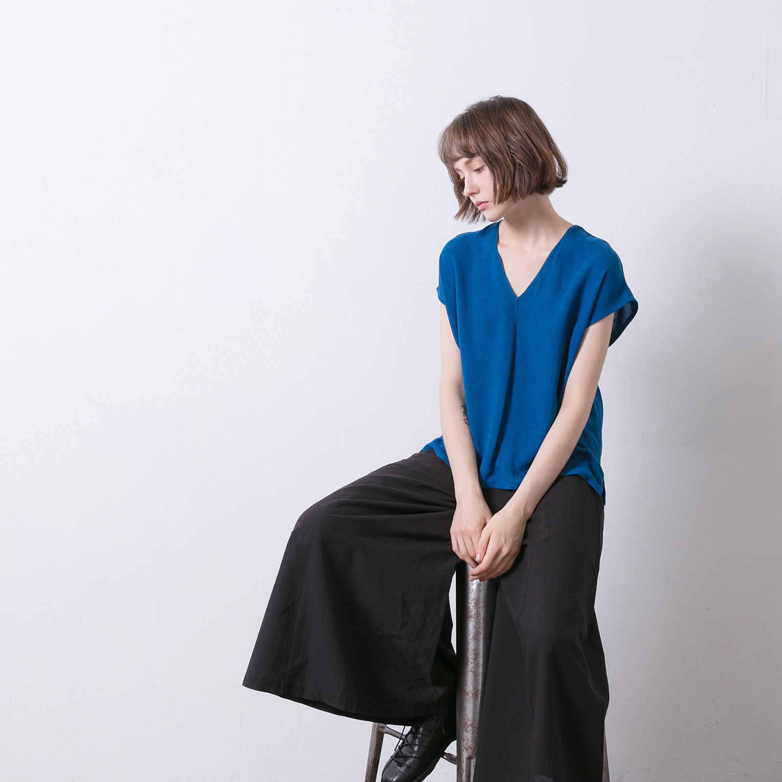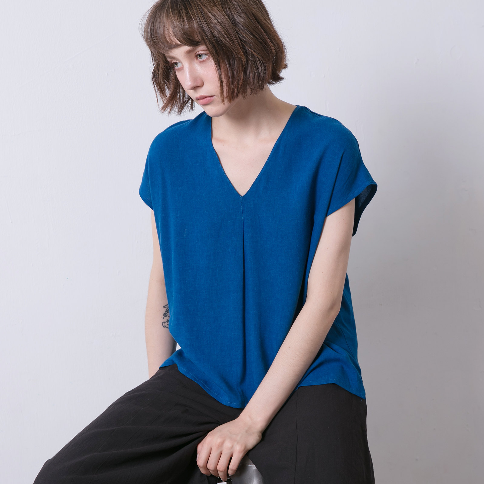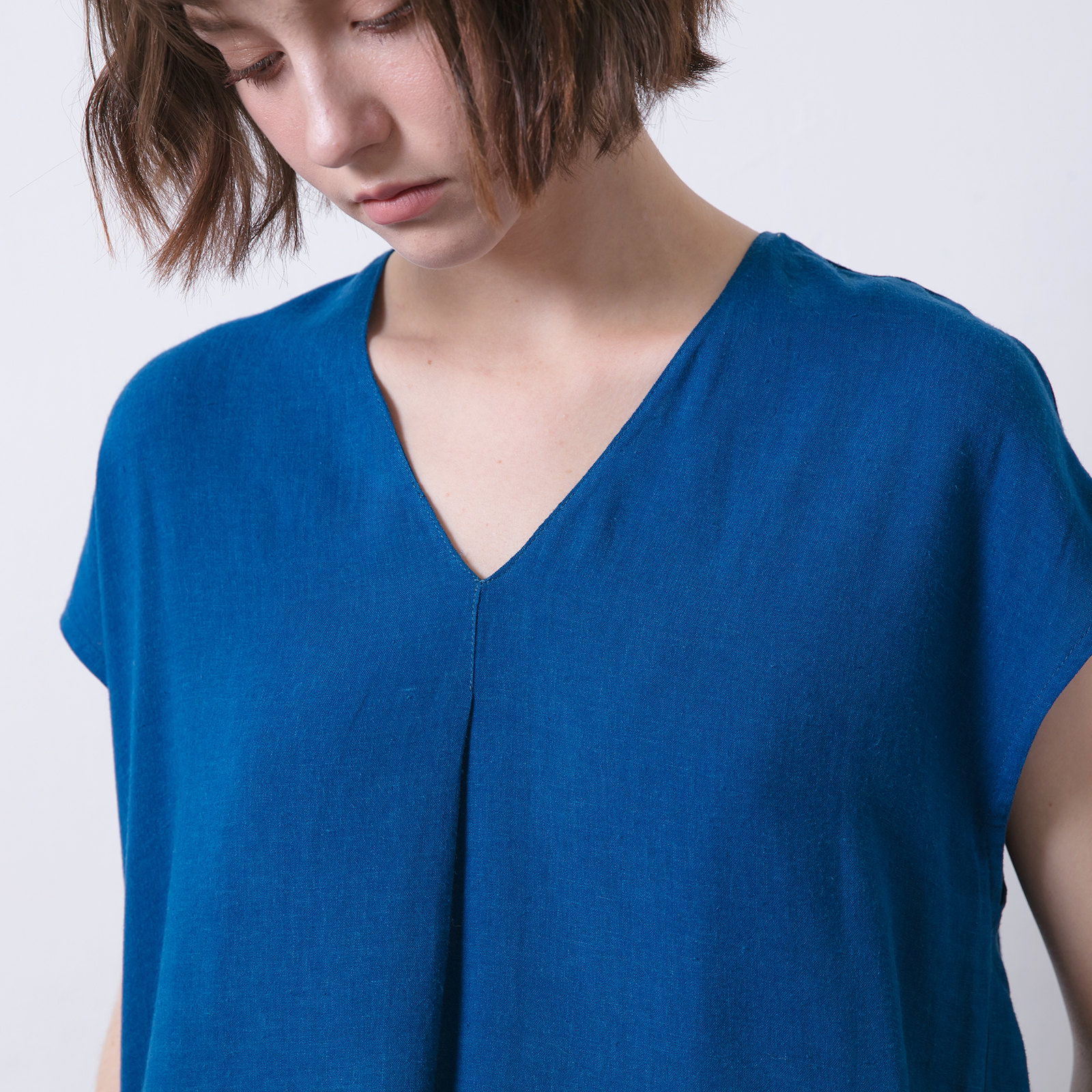 Relaxed V-neck top with drop shoulders in a blue tone.