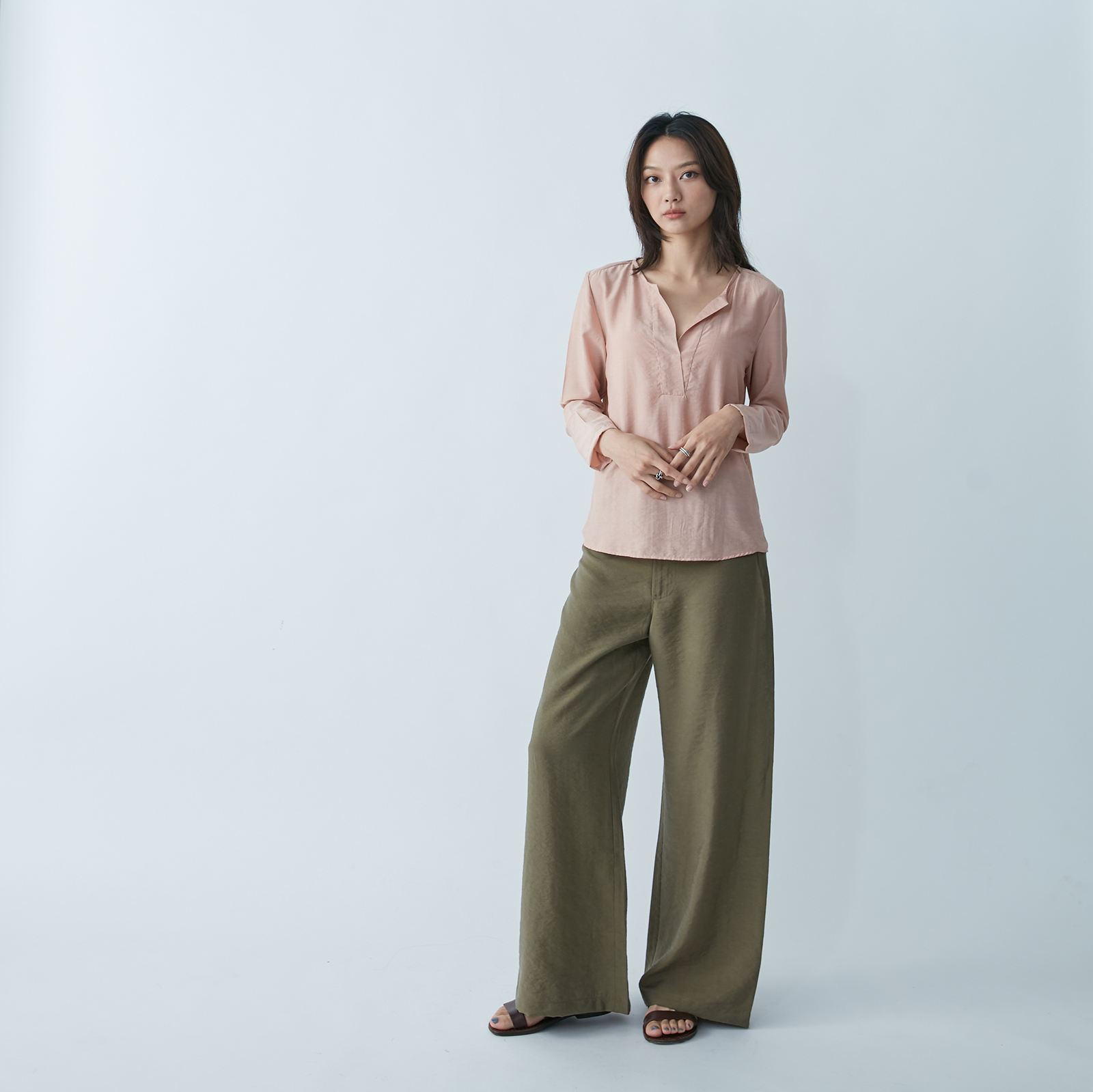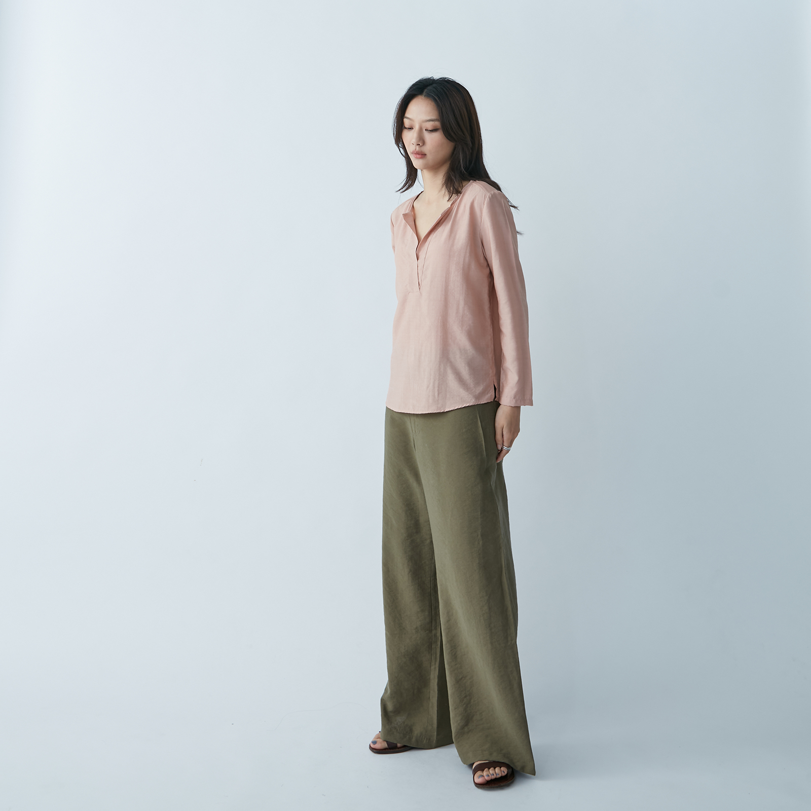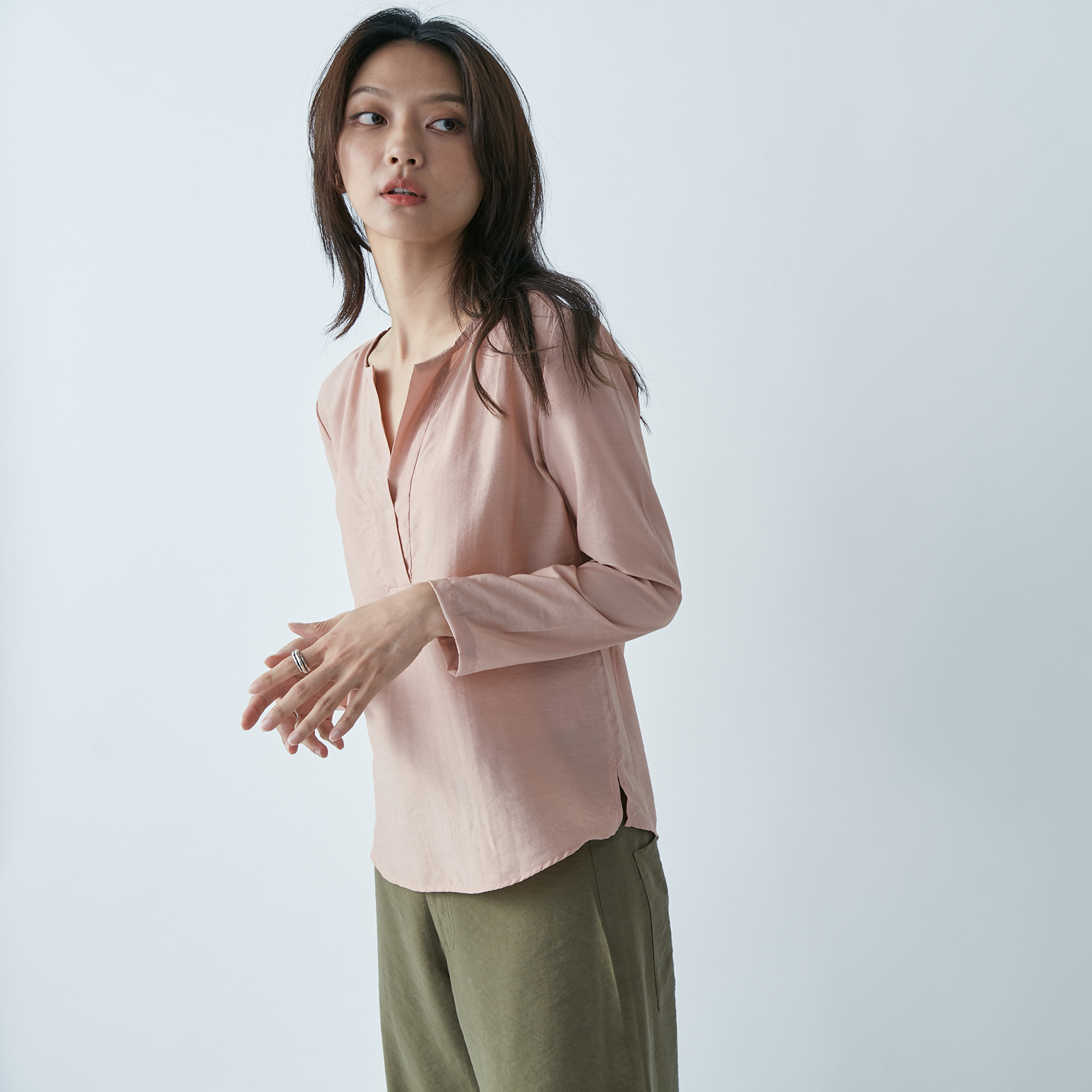 Effortlessly chic, this V‑neck top drapes gracefully in soft pink tones, offering a minimalist, timeless style perfect for any occasion.
