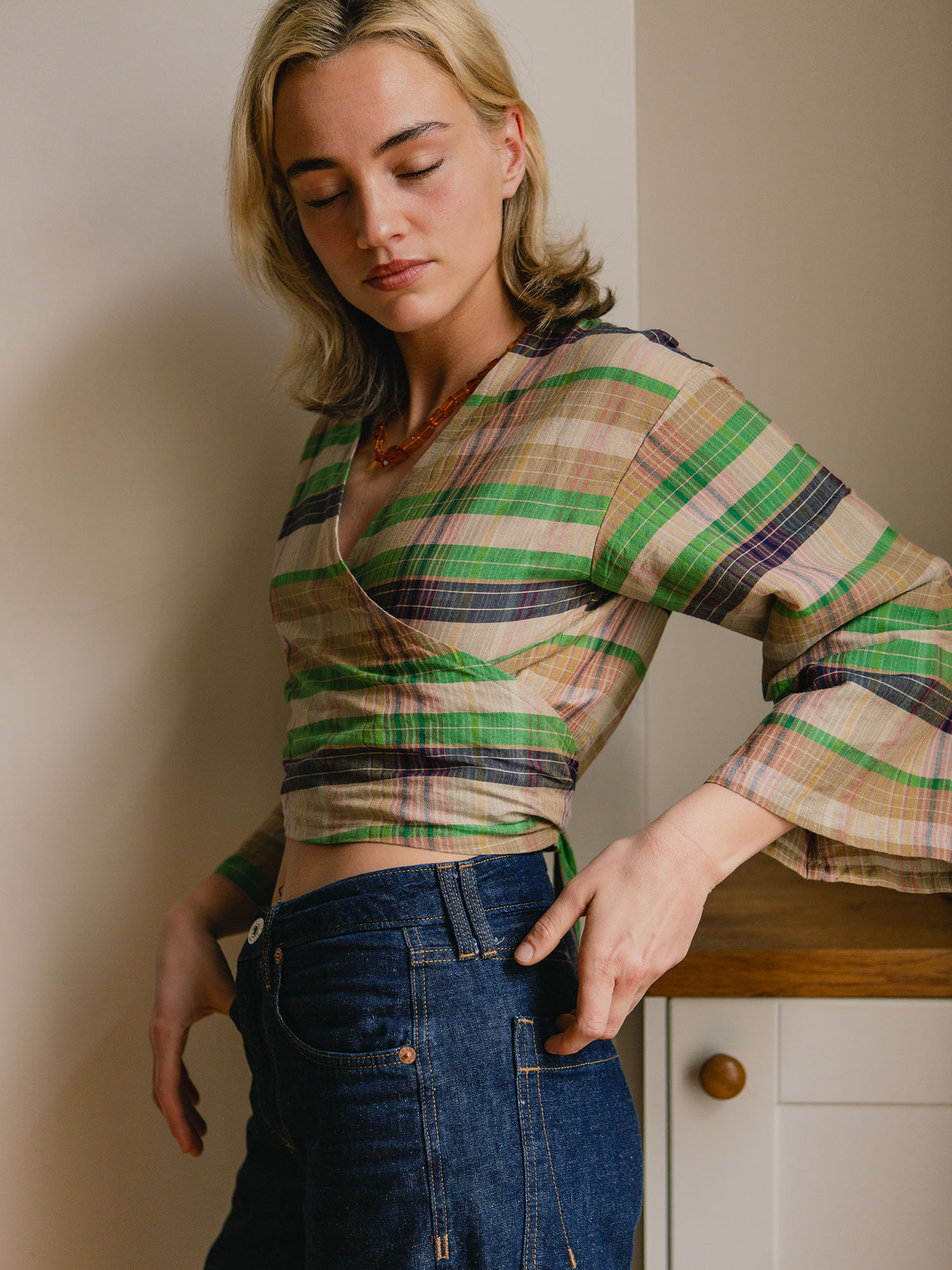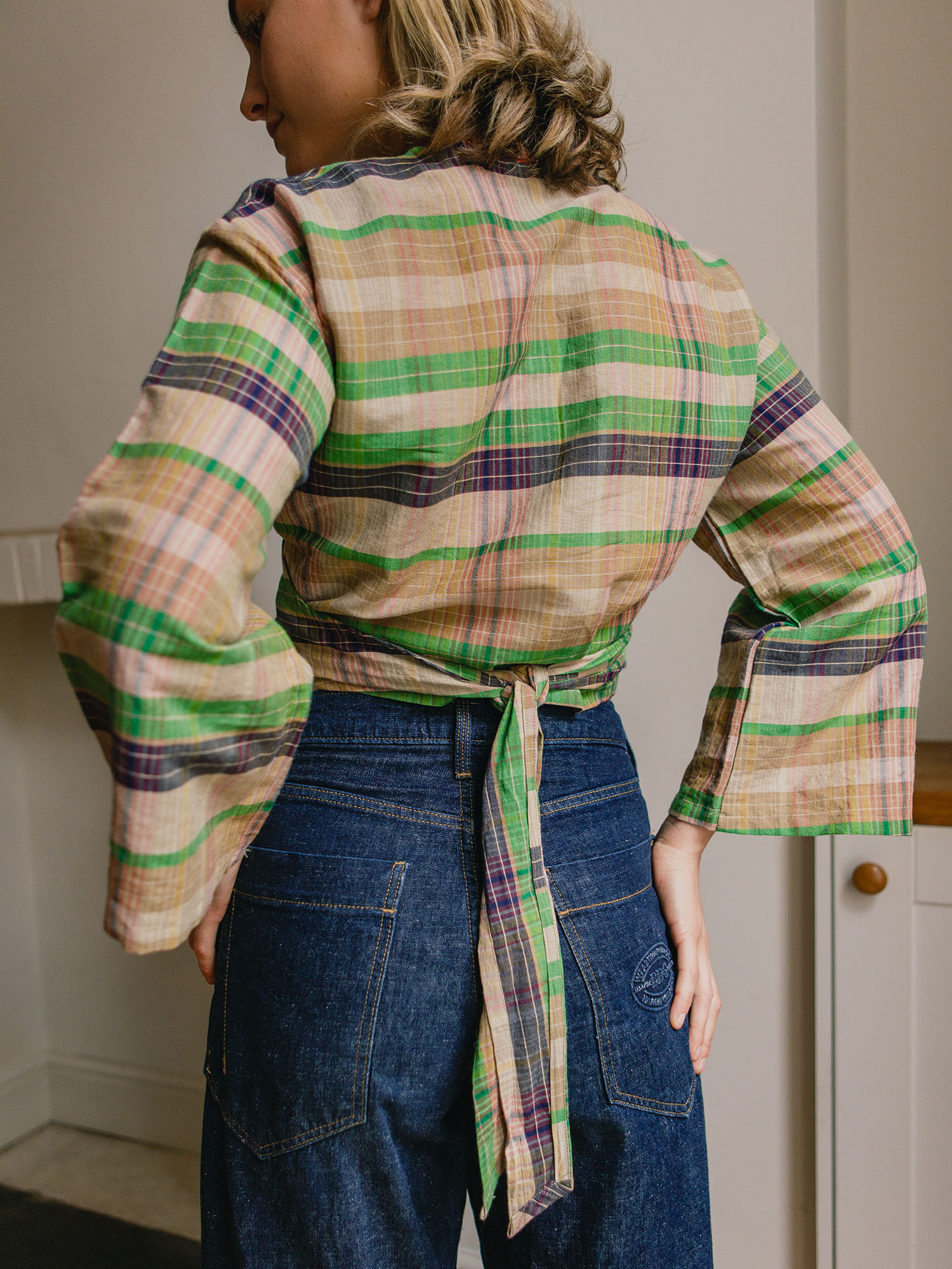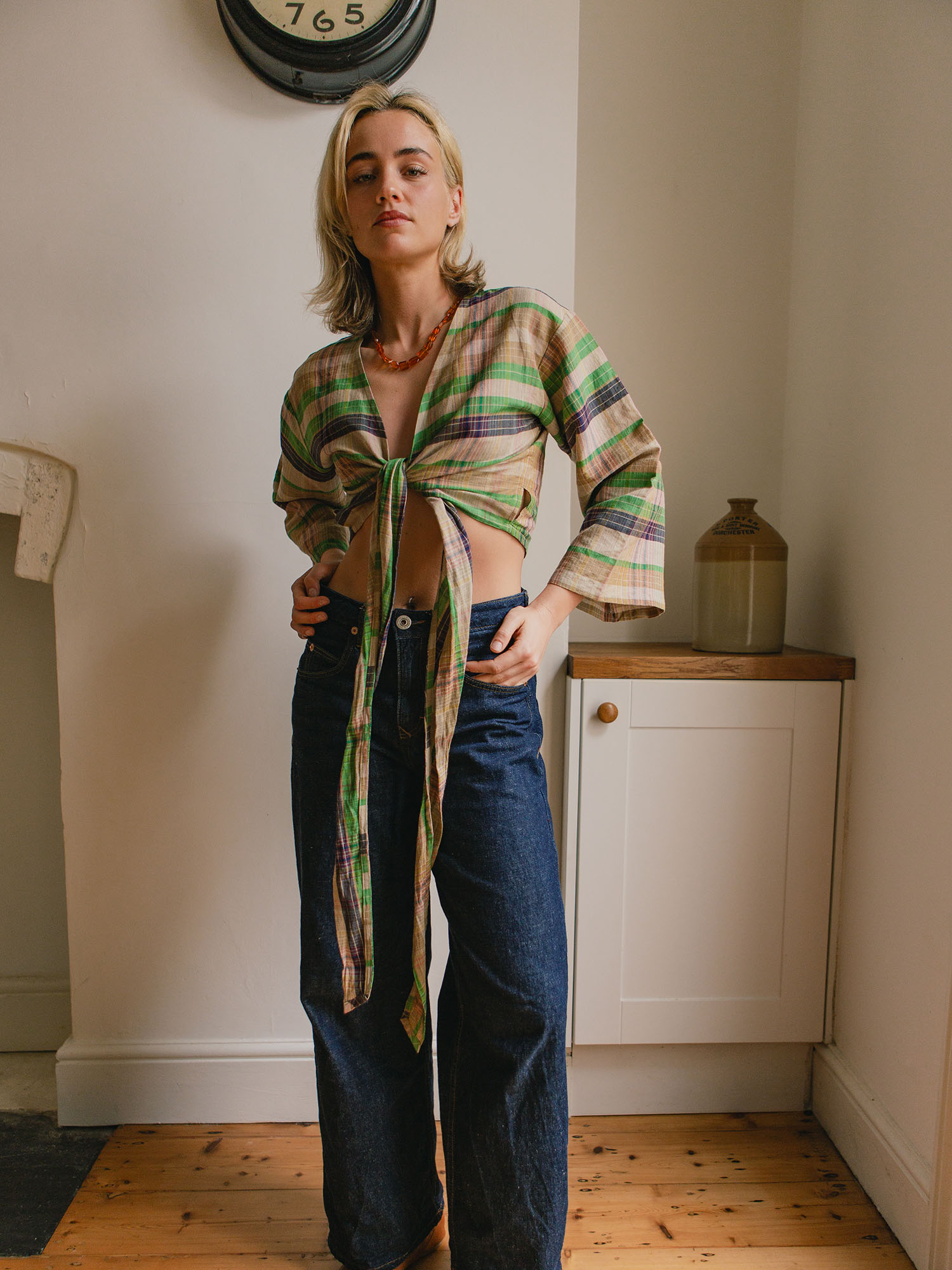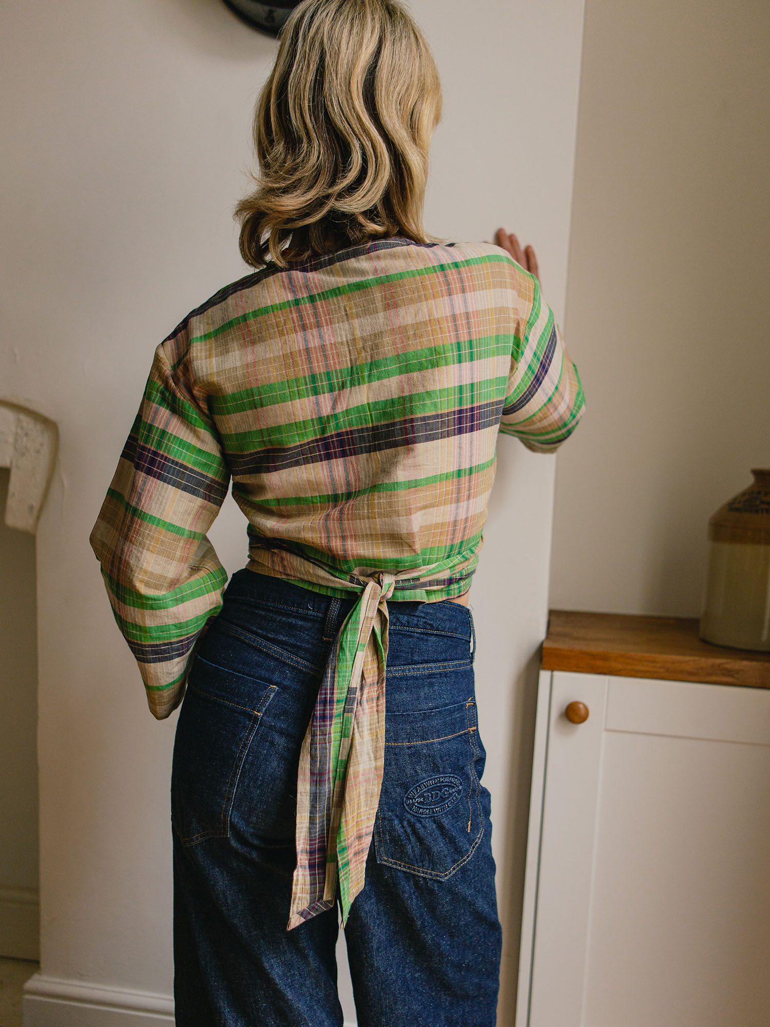 This plaid top features a V‑neck and a versatile tie‑waist design that can be styled either loose or snug. You can tie it at the front for a playful, flirtatious vibe, or cross back the straps for a more elegant, refined silhouette. The lightweight cotton‑linen blend keeps it airy and comfortable — a relaxed yet chic choice for spring or summer layering.