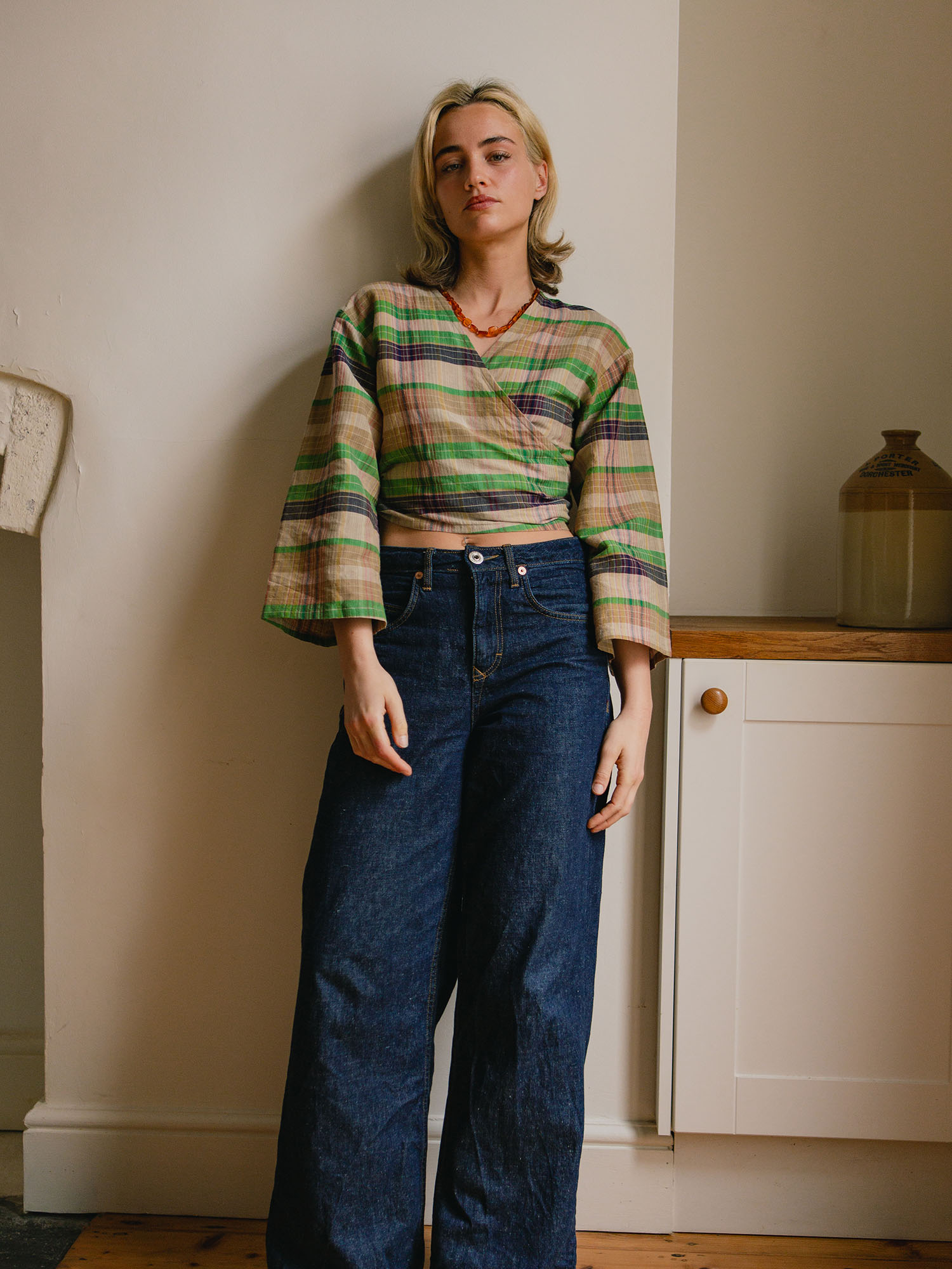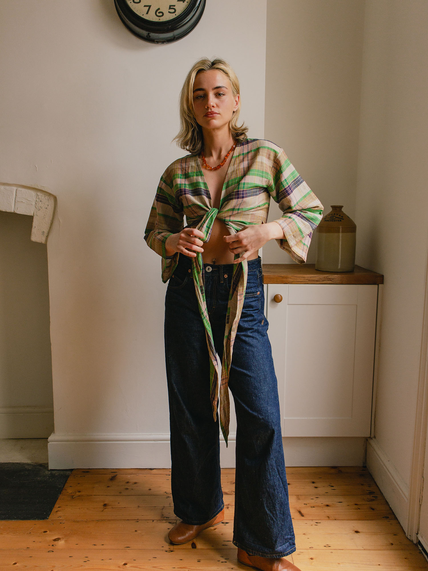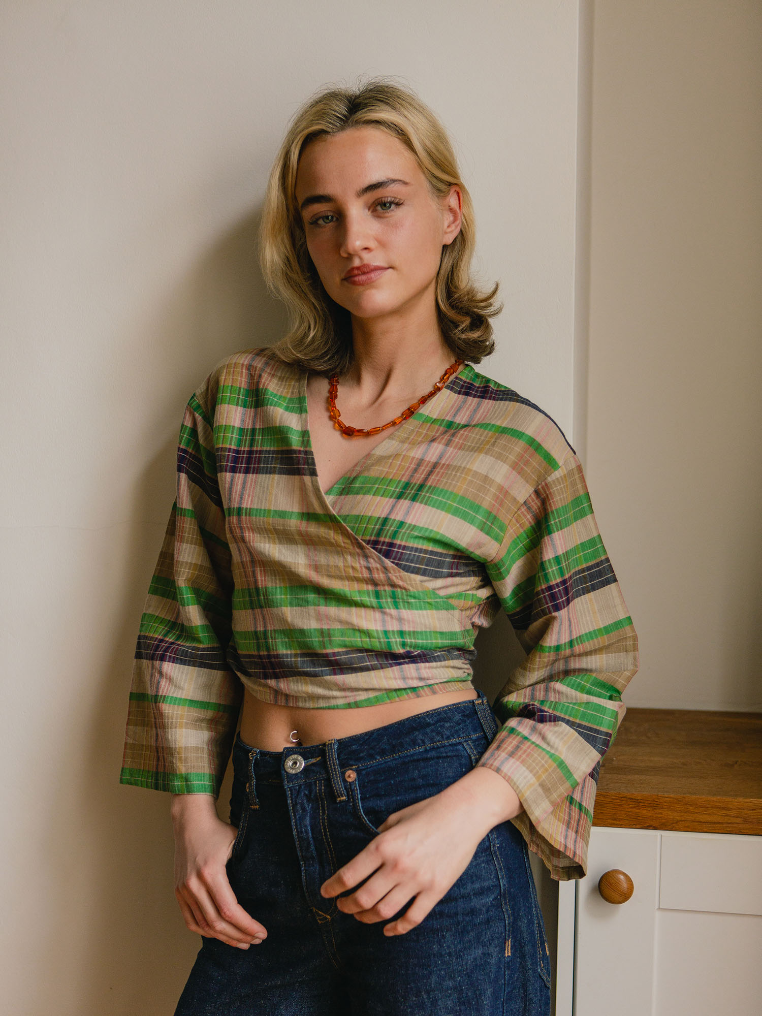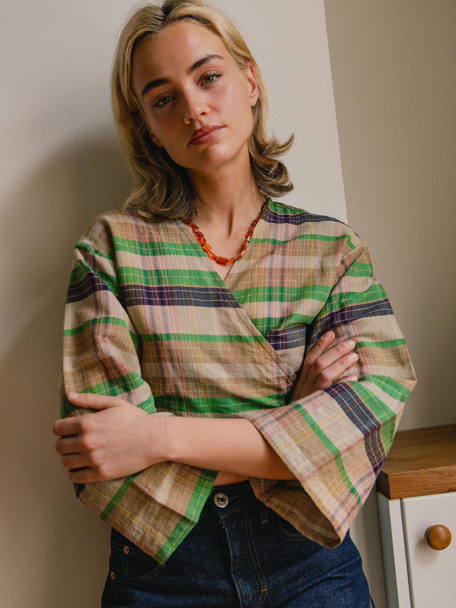 This plaid top features a V‑neck and a versatile tie‑waist design that can be styled either loose or snug. You can tie it at the front for a playful, flirtatious vibe, or cross back the straps for a more elegant, refined silhouette. The lightweight cotton‑linen blend keeps it airy and comfortable — a relaxed yet chic choice for spring or summer layering.