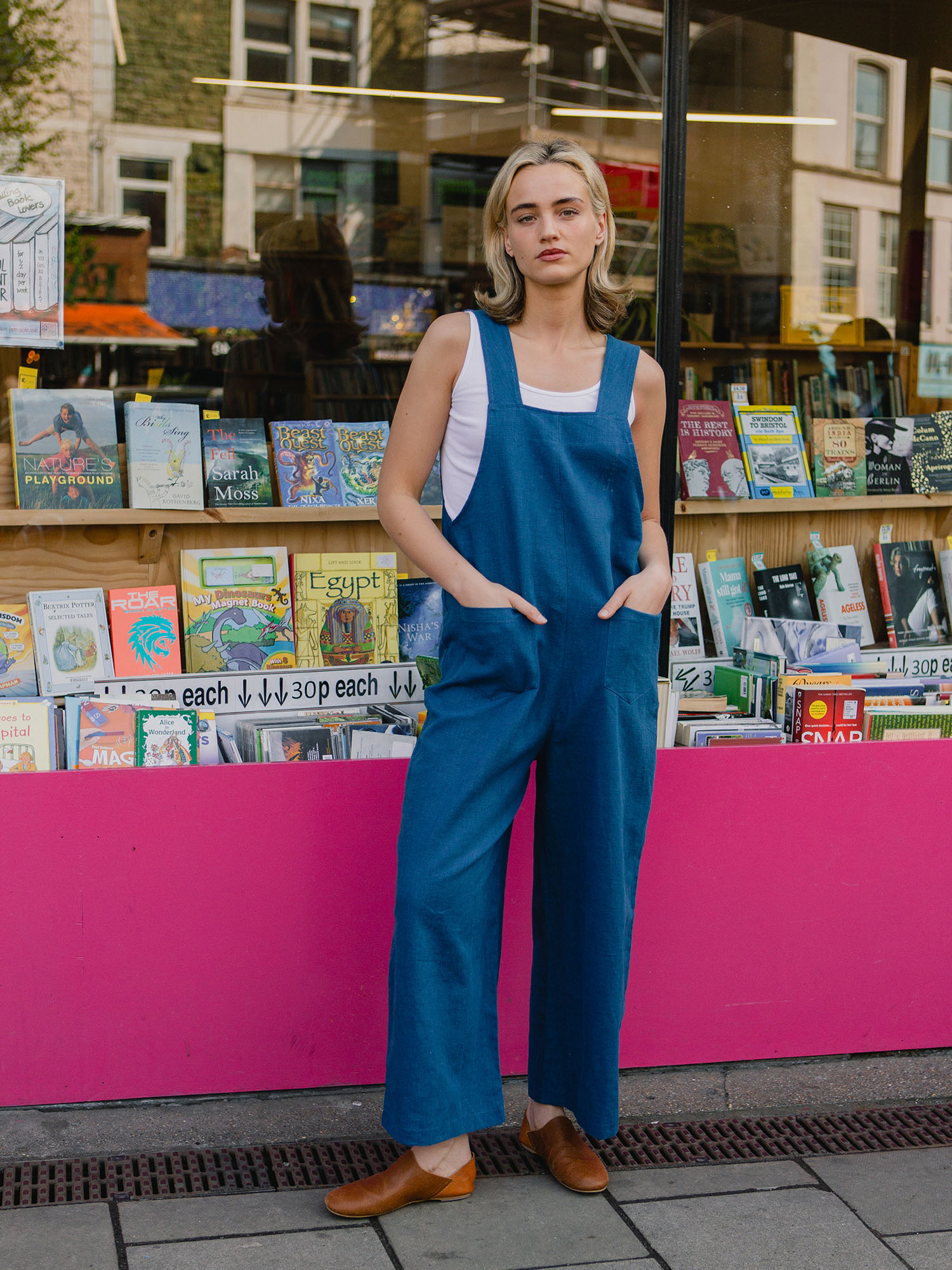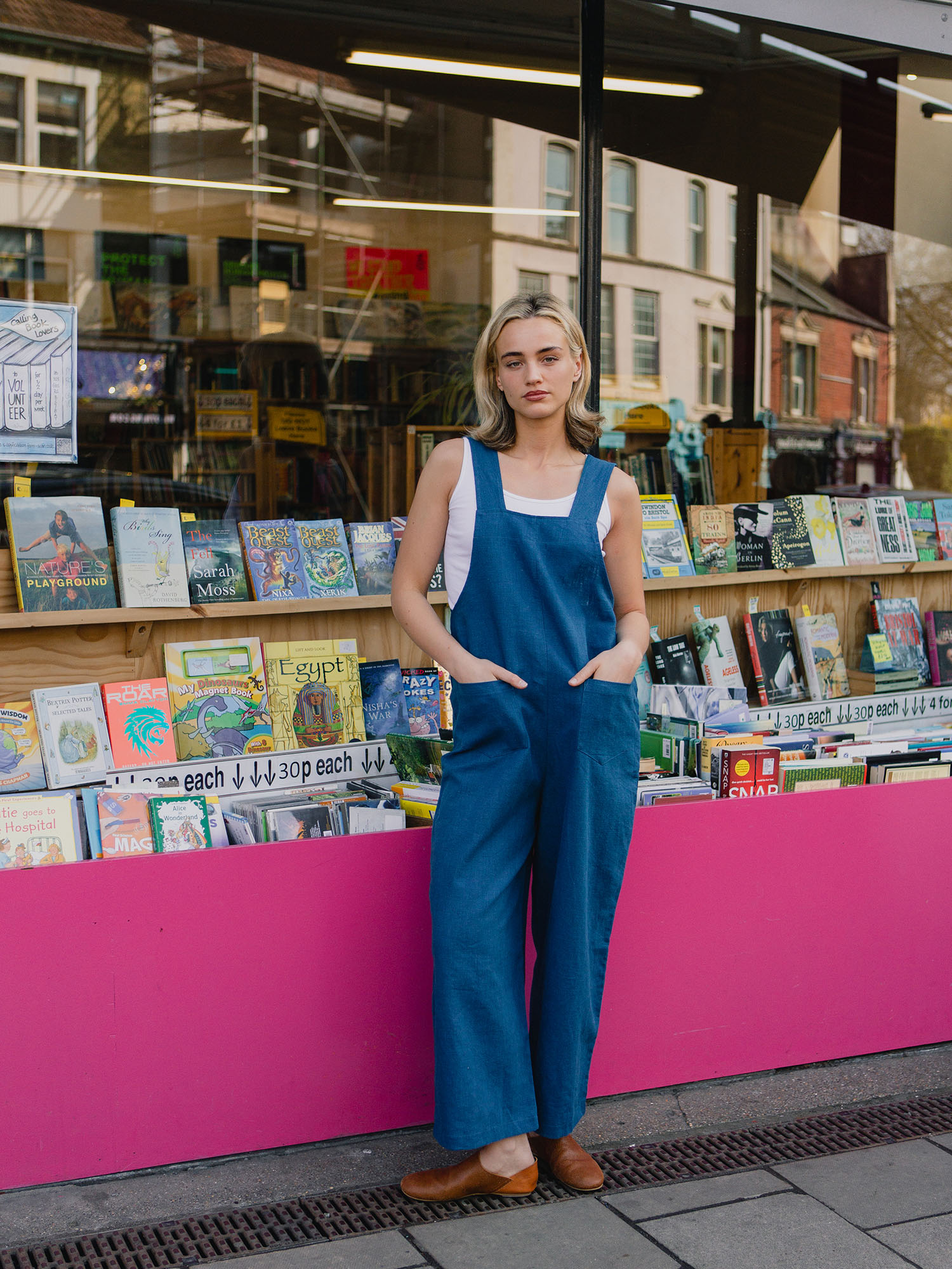 These reversible blue dungarees are cut from a breathable linen and cotton that drapes with ease. The wide legs, deep pockets and clean V-neckline create a relaxed, effortless shape, while the reversible front-to-back design lets you switch between a deeper V or a higher, simpler front. A versatile, laid-back piece made for comfortable everyday layering.